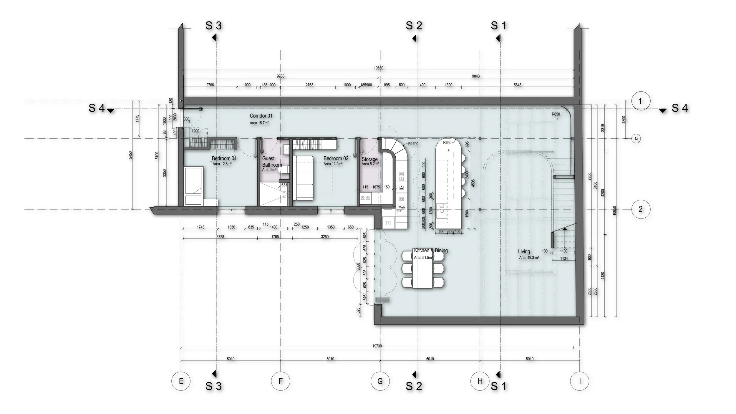 As the building is protected under monument law, the exterior could not be altered. We therefore retained the striking steel window frames, which allow beautiful natural light to fill the interior.